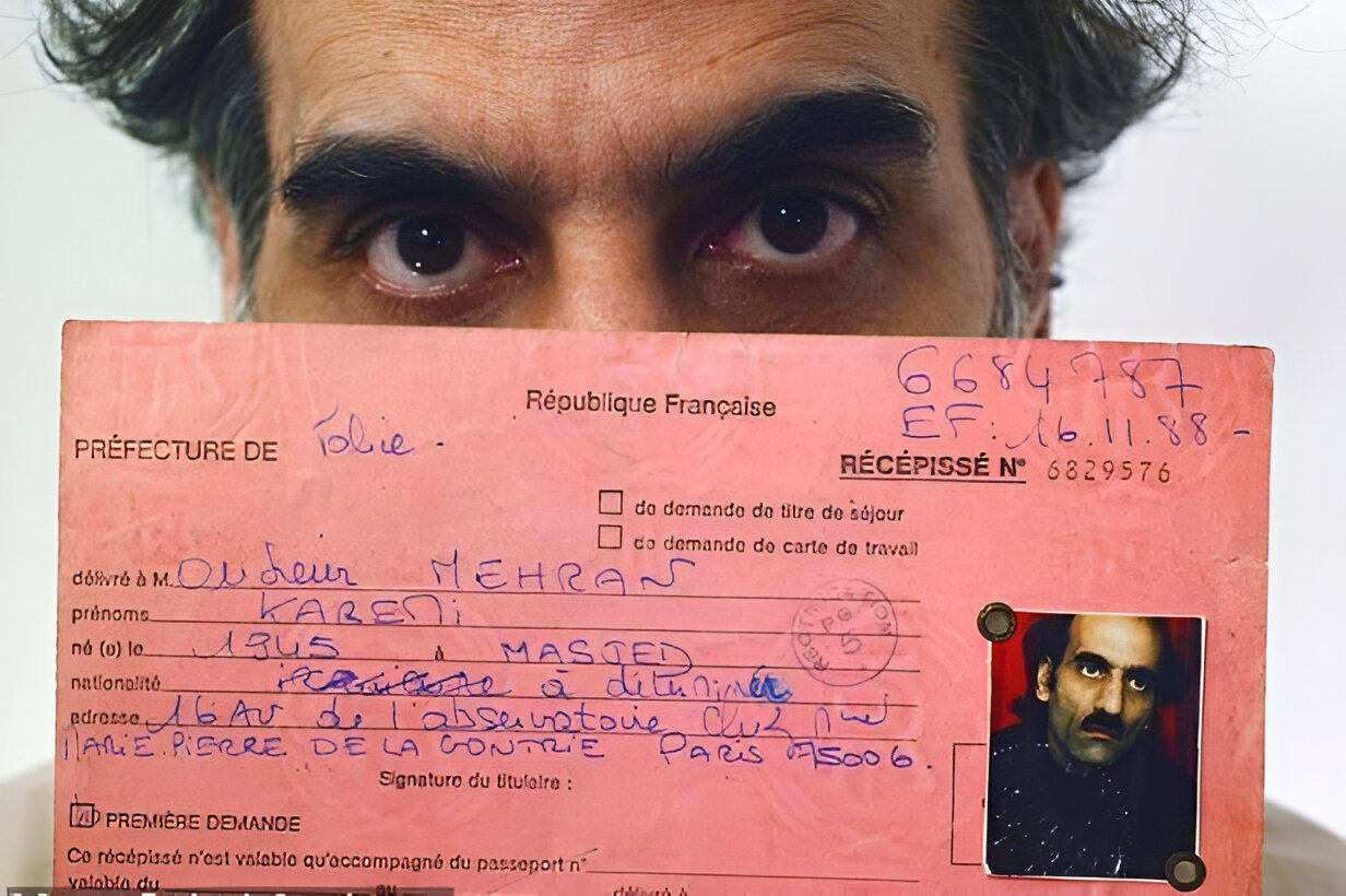 স্থানীয় পুলিশ ষ্টেশন থেকে দেওয়া মেহরান কারিম নাসেরির নথি। এখানে হাতে লেখা কিছু গুরুত্বপূর্ণ তথ্য রয়েছে। উপরের ডানদিকে তারিখটি হলো, ১৯৮৮ সালের ১৬ নভেম্বর। এতে তার নাম, জন্ম সাল ও জন্মস্থান উল্লেখ আছে। ছবি: এএফপি