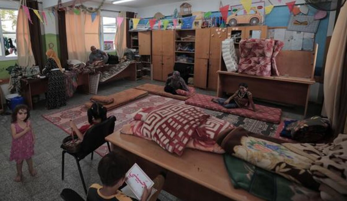 মধ্য গাজার দেইর আল-বালাহ শহরের স্কুলগুলোর একেকটি শ্রেণিকক্ষ এখন আশ্রয়স্থল ও শিক্ষার দ্বৈত ভূমিকা পালন করছে। একই ঘরে একদিকে শিশুদের পাঠচর্চা, অন্যদিকে পরিবারের বসবাস।