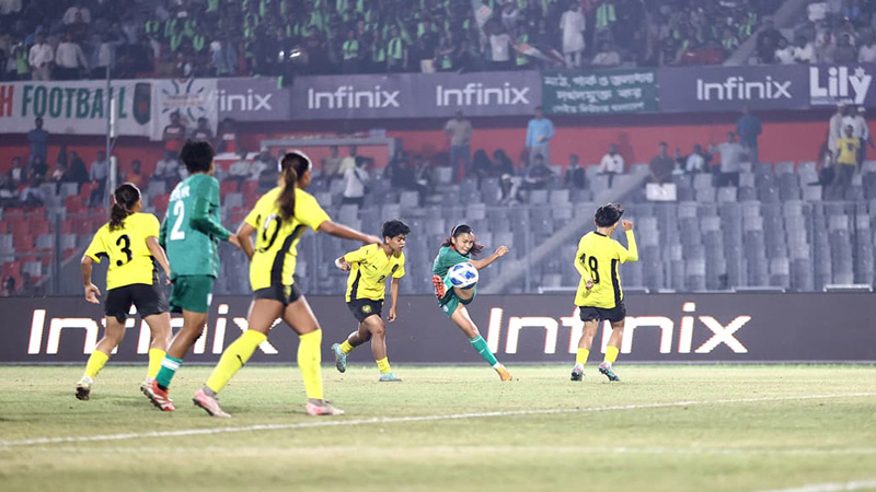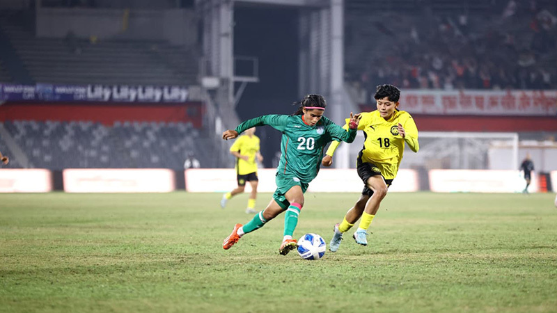 ঢাকার জাতীয় স্টেডিয়ামে তিন জাতির নারী ফুটবল সিরিজে হতাশাজনক সূচনা করেছে বাংলাদেশ। দারুণ দাপট দেখালেও সুযোগ নষ্ট আর রক্ষণভাগের এক ভুলে মালয়েশিয়ার কাছে ১–০ ব্যবধানে হারতে হয়েছে পিটার বাটলারের শিষ্যদের। তিন বছর আগে কমলাপুরে মালয়েশিয়াকে ৬–০ গোলে উড়িয়ে দিয়েছিল যে বাংলাদেশ—সেই স্মৃতিও সময়ের ব্যবধানে উল্টো ‘প্রতিশোধে’ পরিণত হলো অতিথিদের কাছে।